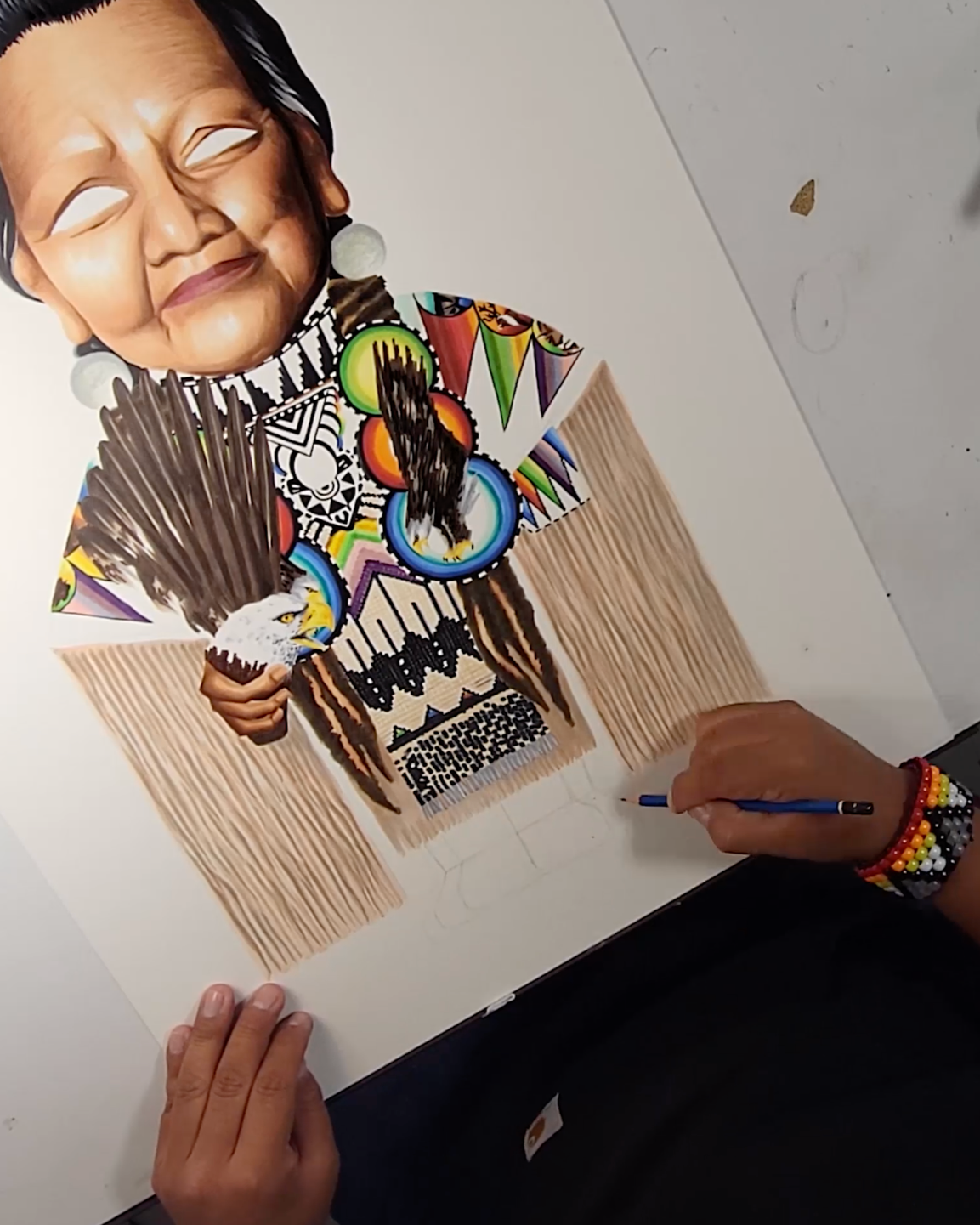 This piece is dedicated to my mom, Ione Yellowjohn — artist, beader, and my biggest inspiration. I’ve drawn her many times, but this one means the most, created during my first Artist in Residency at the Institute of American Indian Arts, where it all began. It’s nearly impossible to recreate her brilliance, especially her regalia, but this is my love letter to her creativity and to all mothers who inspire us to be better artists and people.
